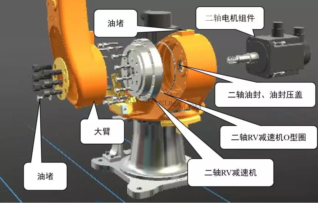 如下圖庫卡機(jī)械臂二軸部位爆炸圖,包含電機(jī),減速機(jī),油封位置,O型圈位置,注油口和排油口位置。