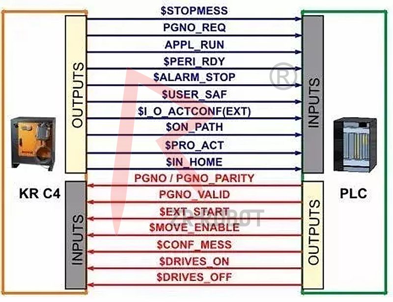 2.上級控制系統通過外部自動運行接口向機器人控制系統發出機器人進程的相關信號 (如運行許可、故障確認、程序啟動等)。機器人控制系統向上級控制系統發送有關運行狀態和故障狀態的信息。